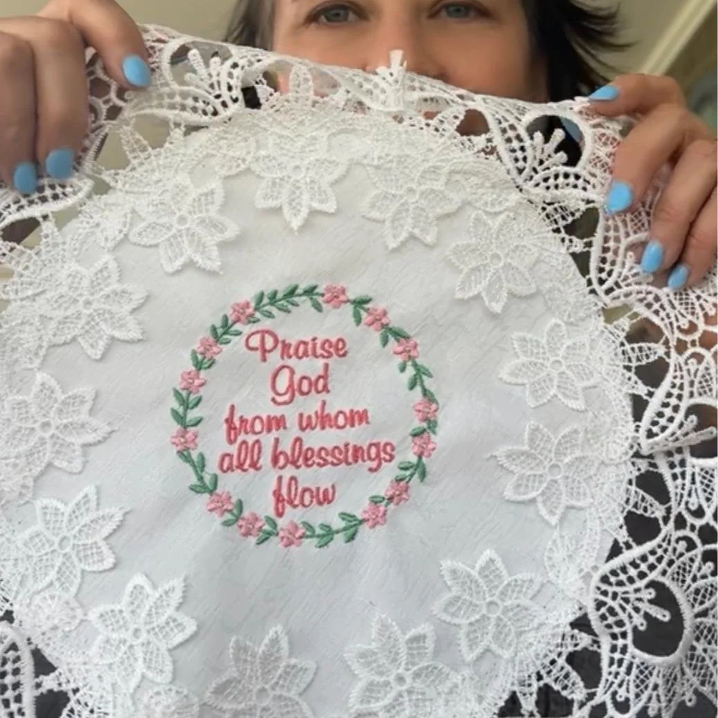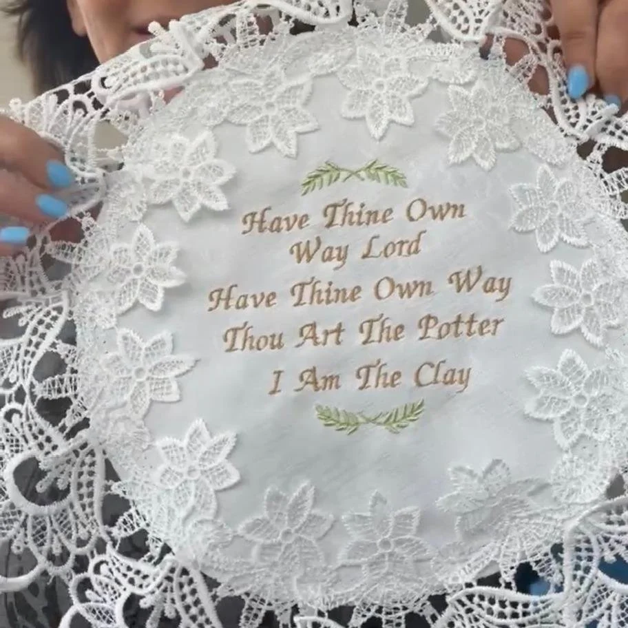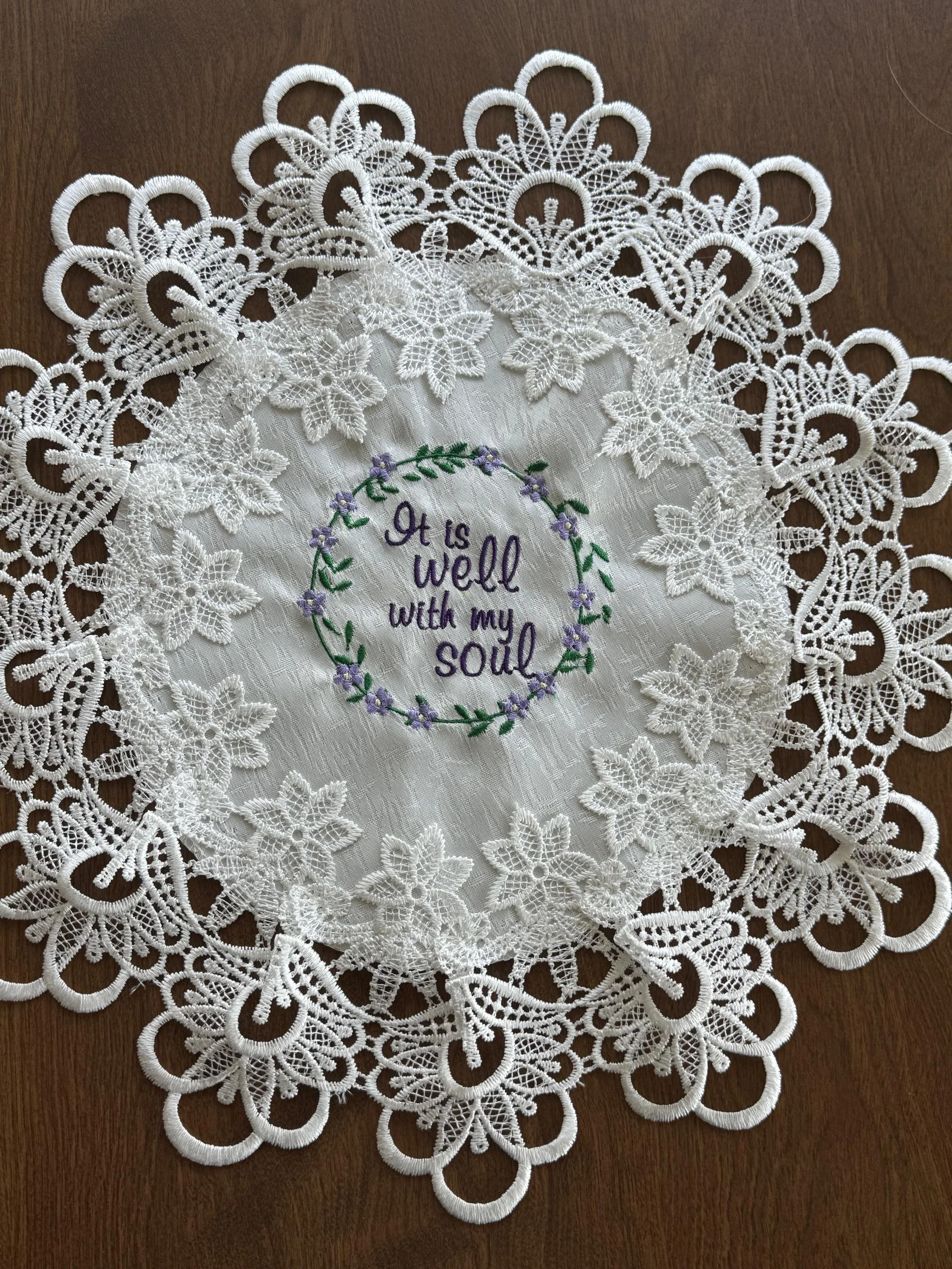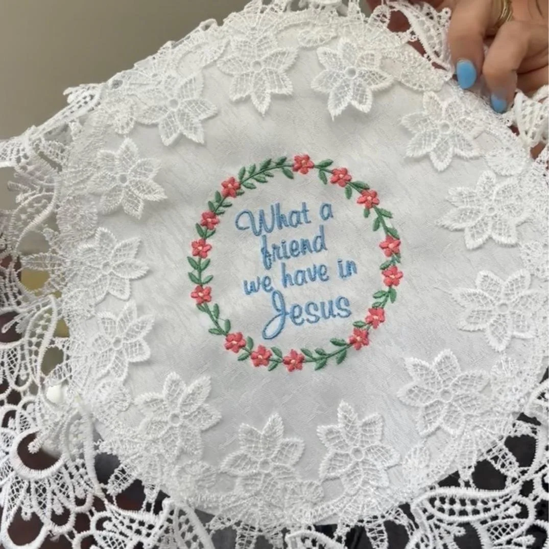 Add a touch of grace and devotion to your home with this beautiful 16-inch white doily, lovingly embroidered with the cherished hymn: