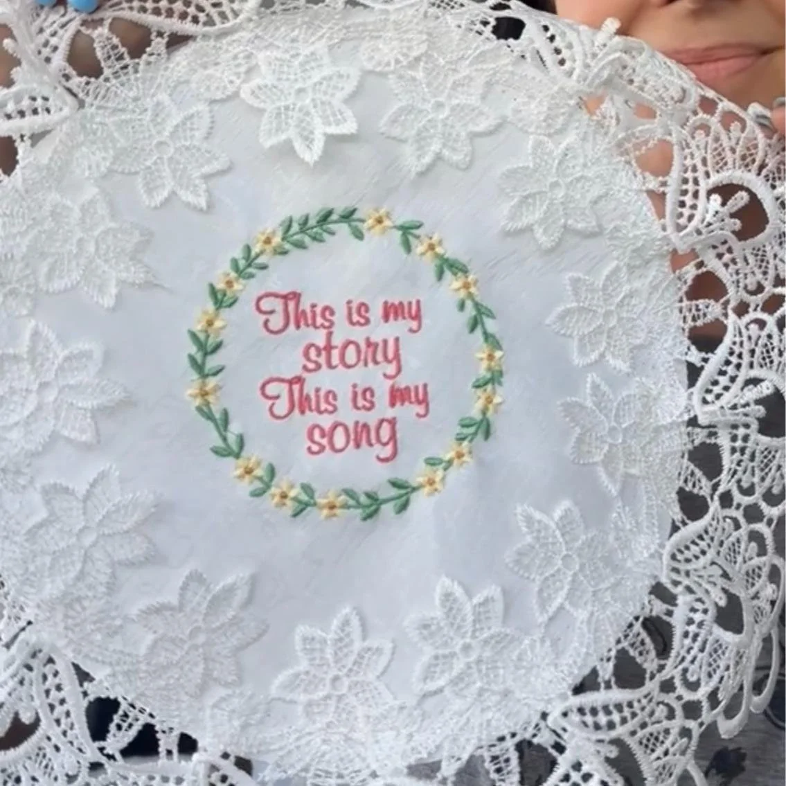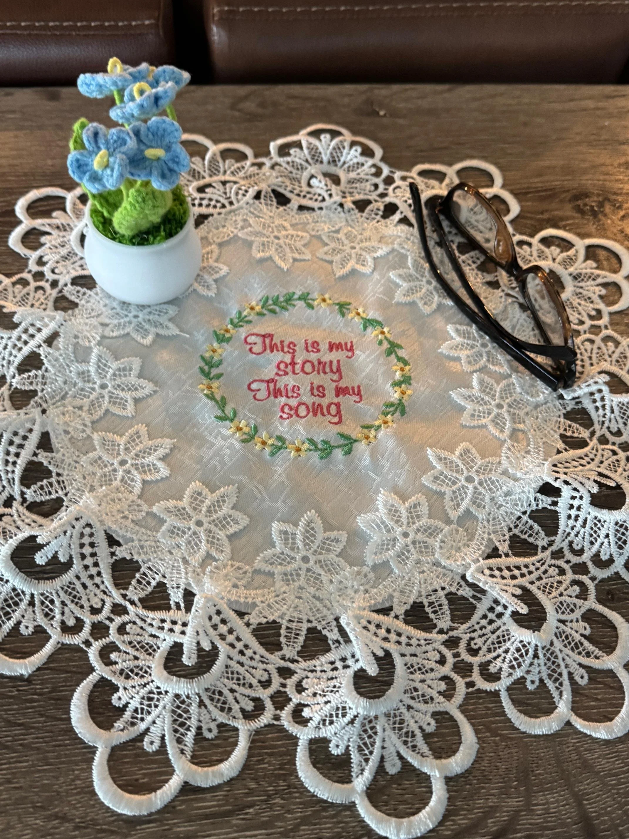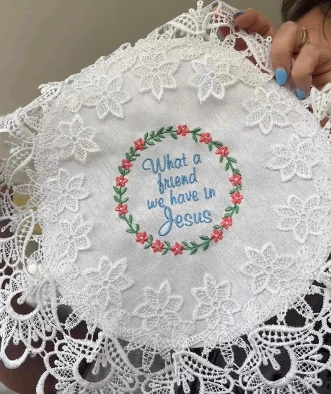 Add a touch of grace and devotion to your home with this beautiful 16-inch white doily, lovingly embroidered with the cherished hymn: