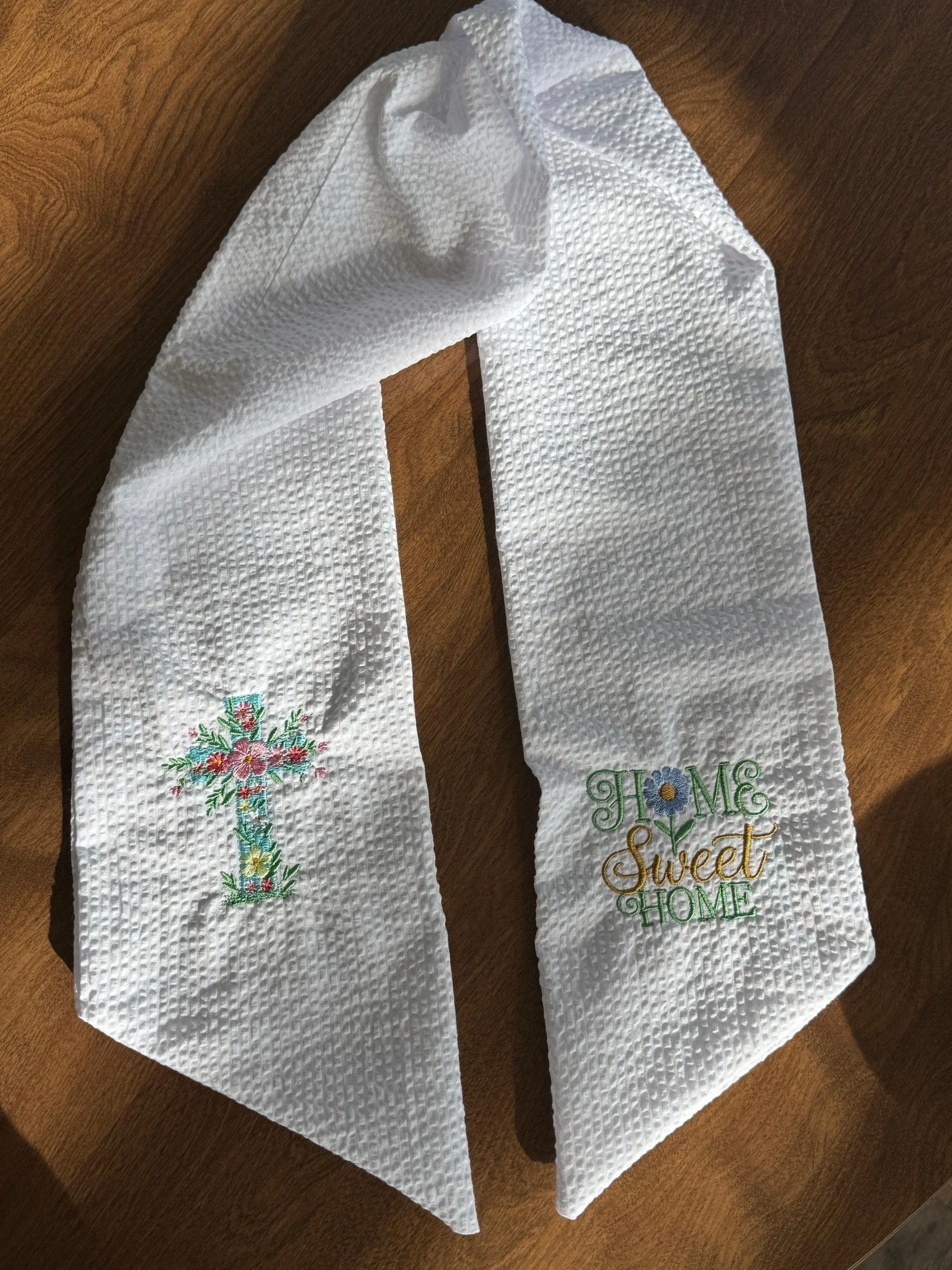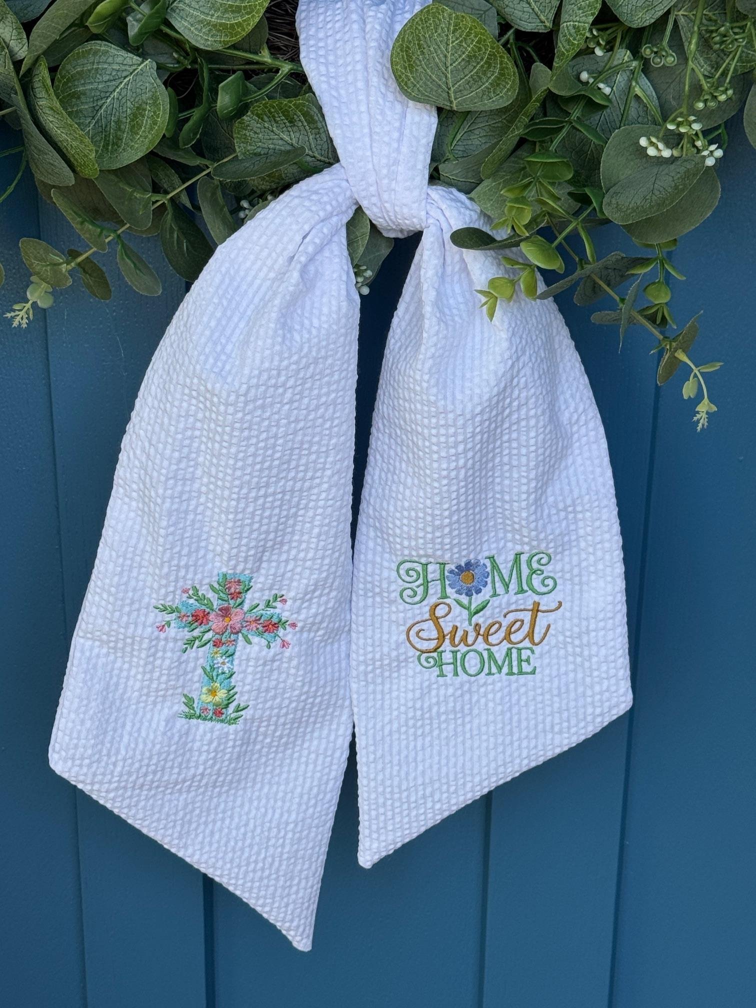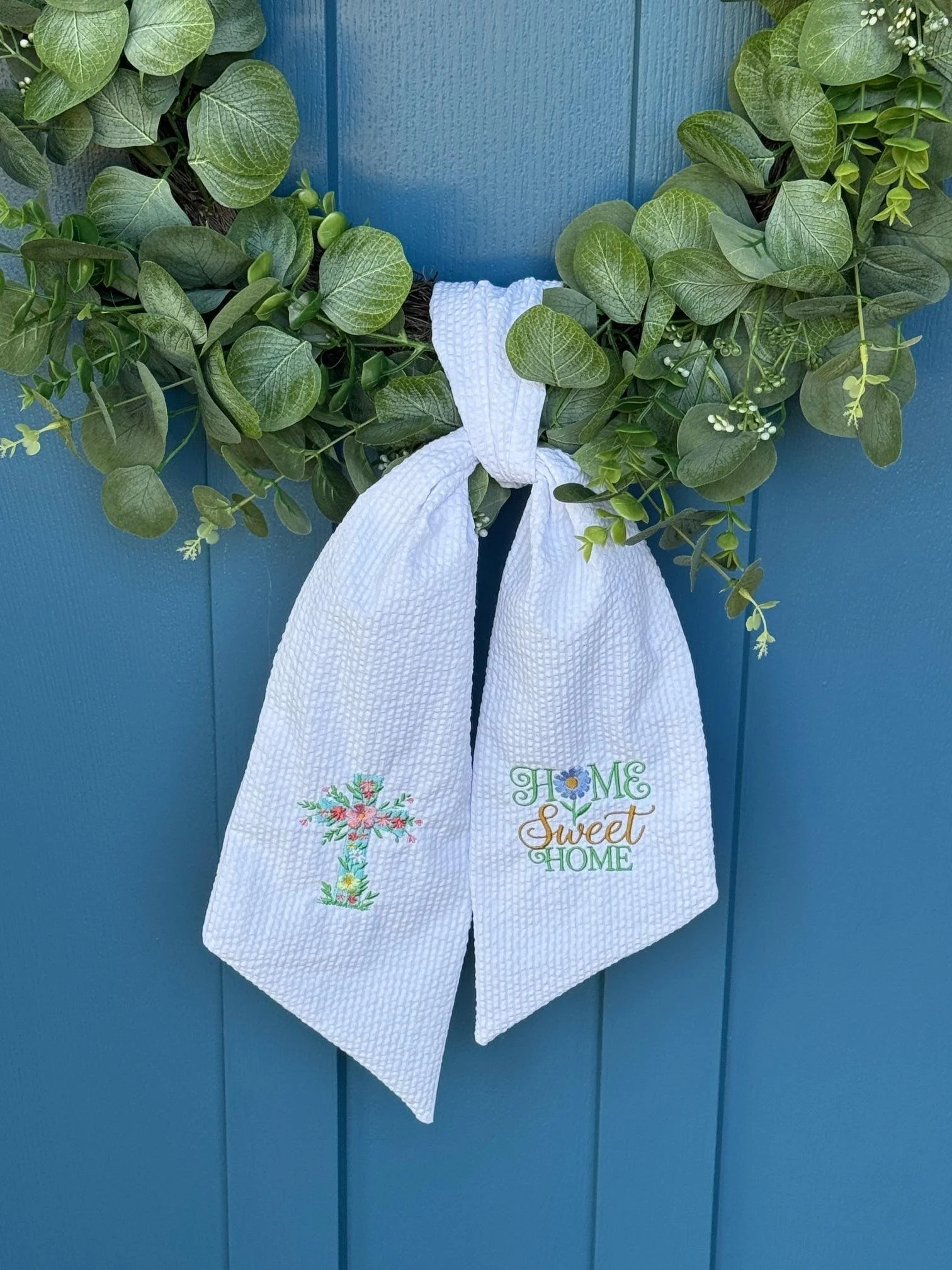 Refresh your front door with our 44" white seersucker wreath sash — light, textured, and perfectly drapable. One end features a vibrant, machine-embroidered cross surrounded by colorful flowers; the opposite end is finished with elegant “Home Sweet Home” lettering. Expert stitching, weather-ready fabric, and a timeless, welcoming look make this sash the perfect accent for wreaths, doors, porches, or seasonal decor. Add a touch of charm and faith to your home — order yours today!