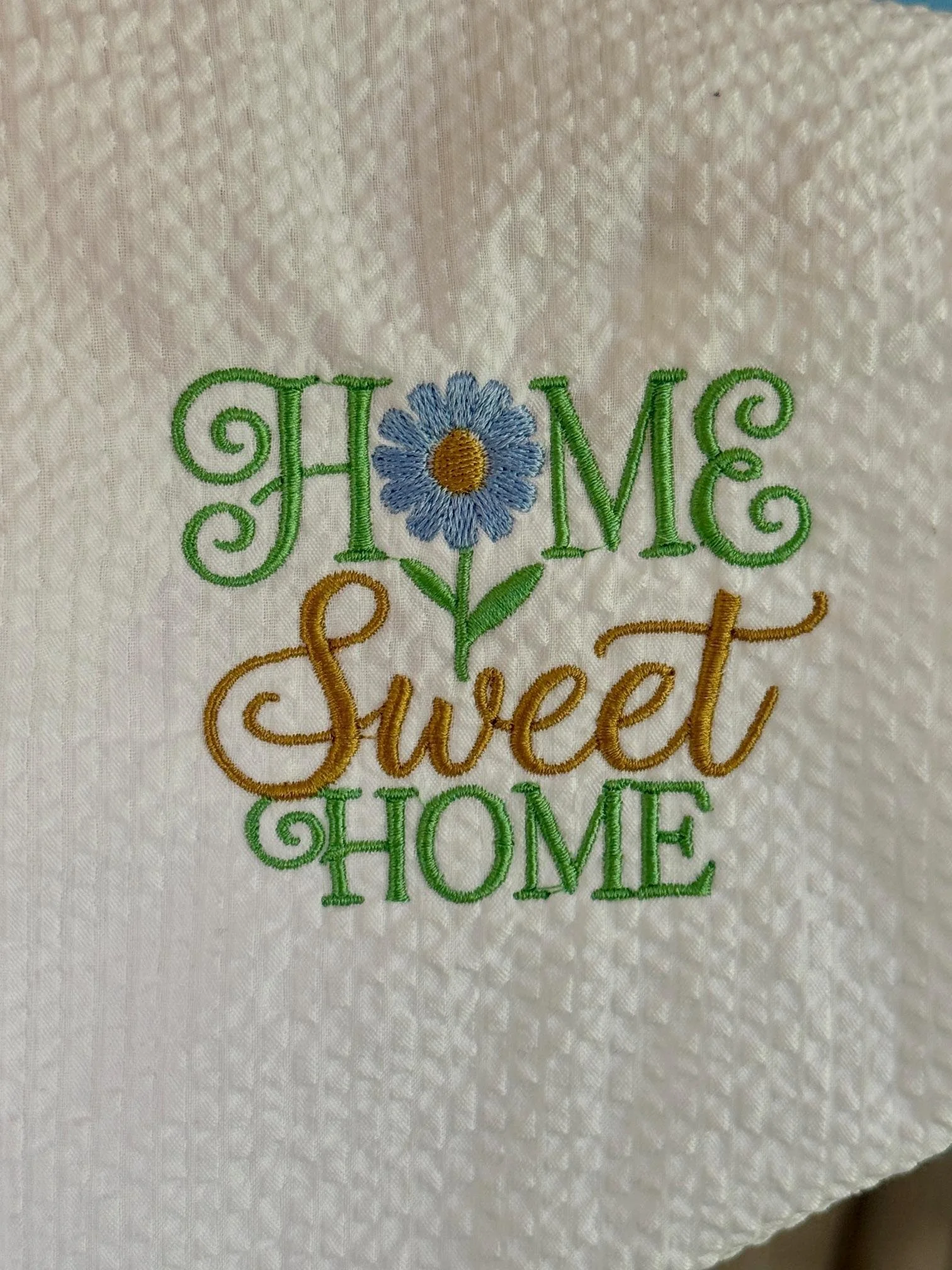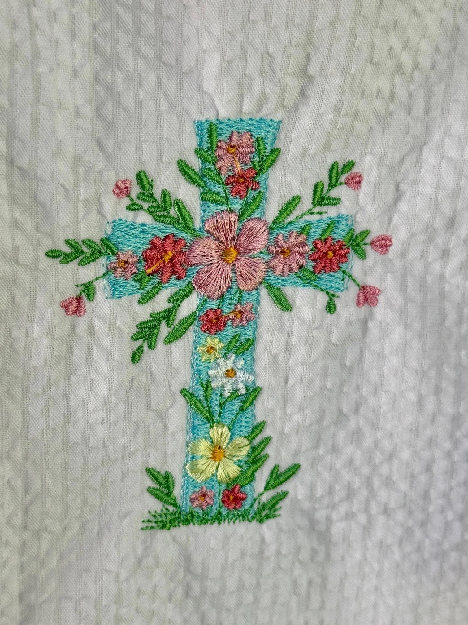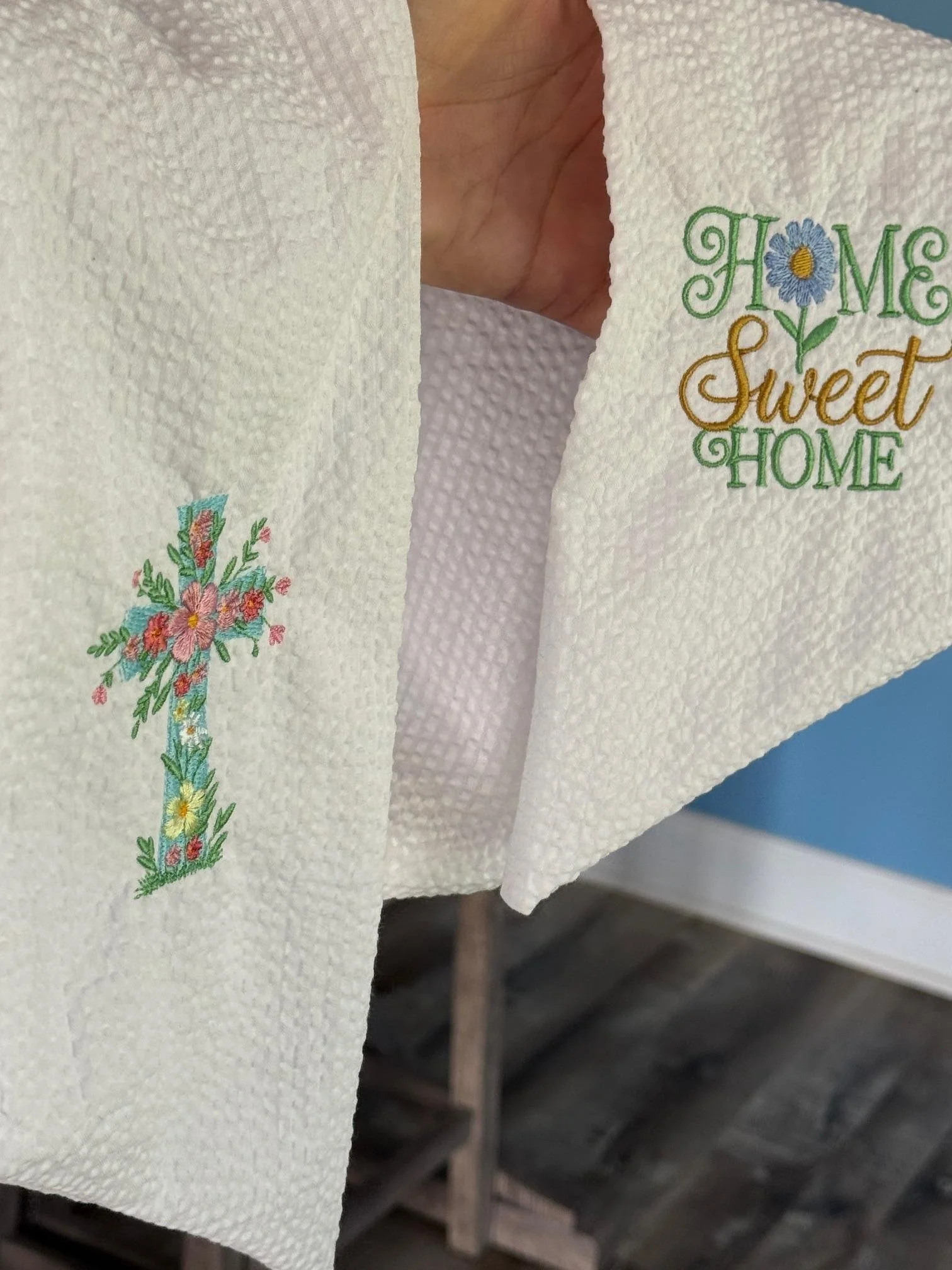 Refresh your front door with our 44" white seersucker wreath sash — light, textured, and perfectly drapable. One end features a vibrant, machine-embroidered cross surrounded by colorful flowers; the opposite end is finished with elegant “Home Sweet Home” lettering. Expert stitching, weather-ready fabric, and a timeless, welcoming look make this sash the perfect accent for wreaths, doors, porches, or seasonal decor. Add a touch of charm and faith to your home — order yours today!