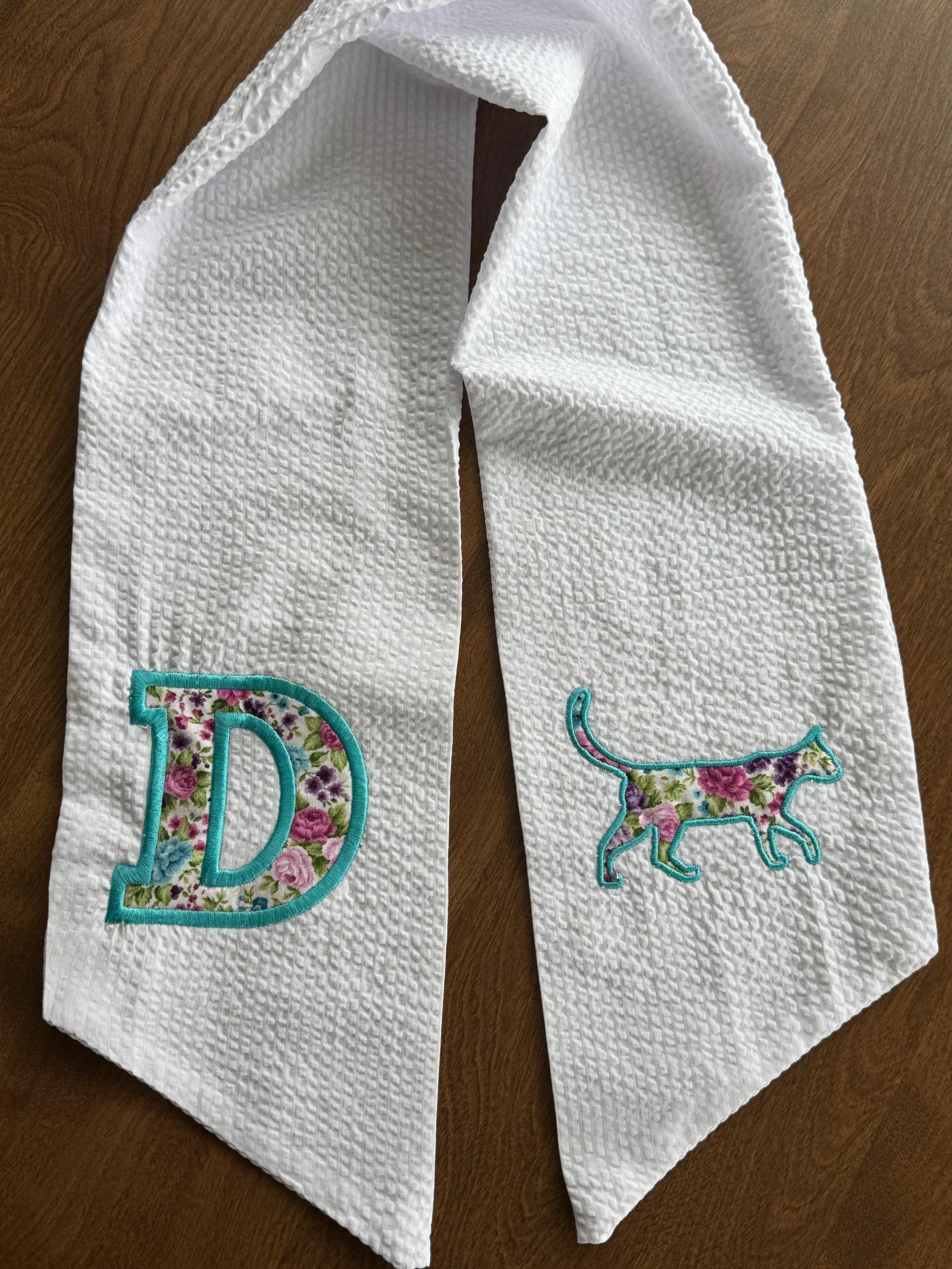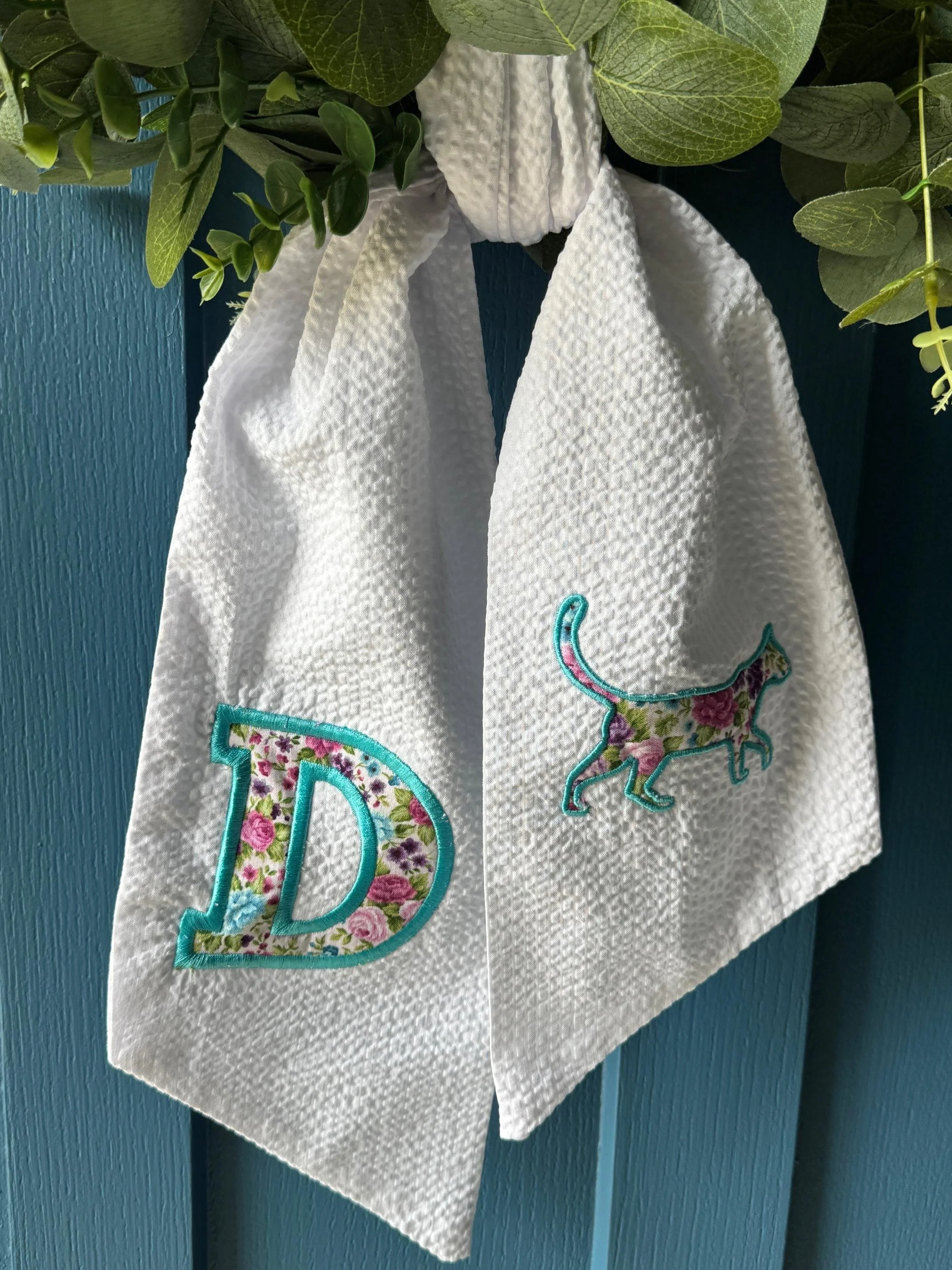 Our charming white 42" seersucker wreath sash is the perfect way to welcome the season. Designed with timeless texture and soft elegance, each sash features a beautifully appliquéd floral initial on one side—and a sweet appliqué cat on the other for a playful, personal touch.