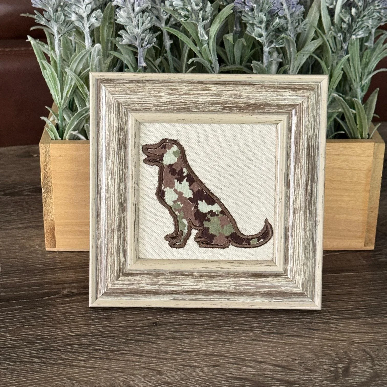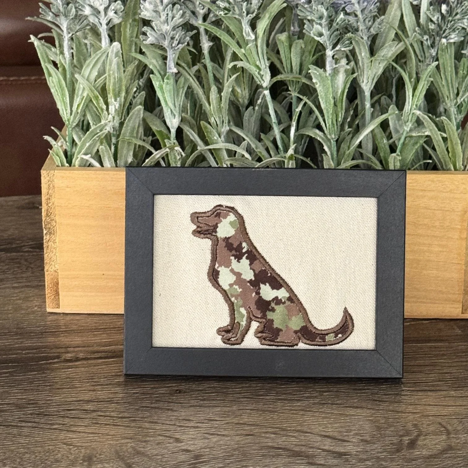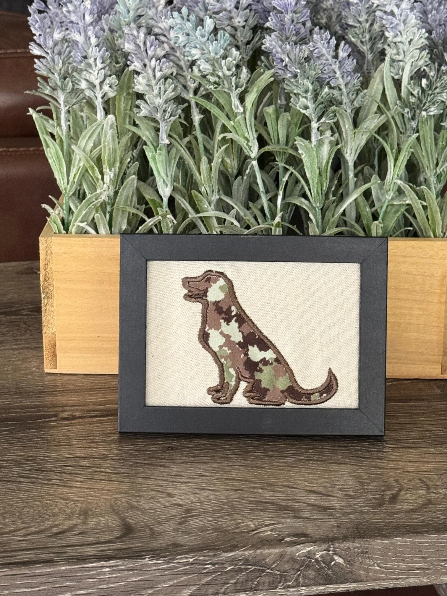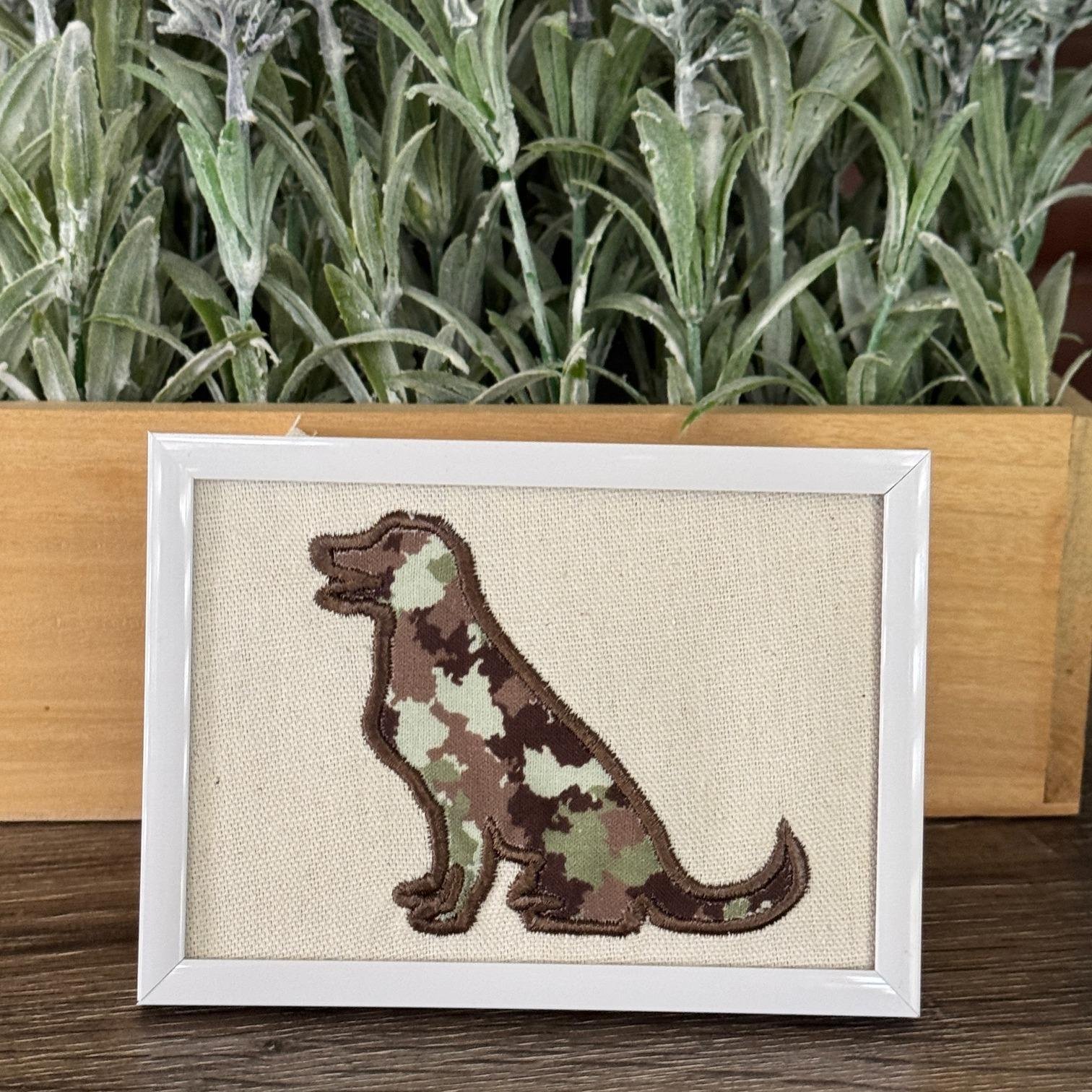 Add a rustic, outdoorsy touch to your home with this Labrador Retriever machine-embroidered appliqué made with camouflage fabric. Perfect for hunters, Lab lovers, and anyone who appreciates country style décor!