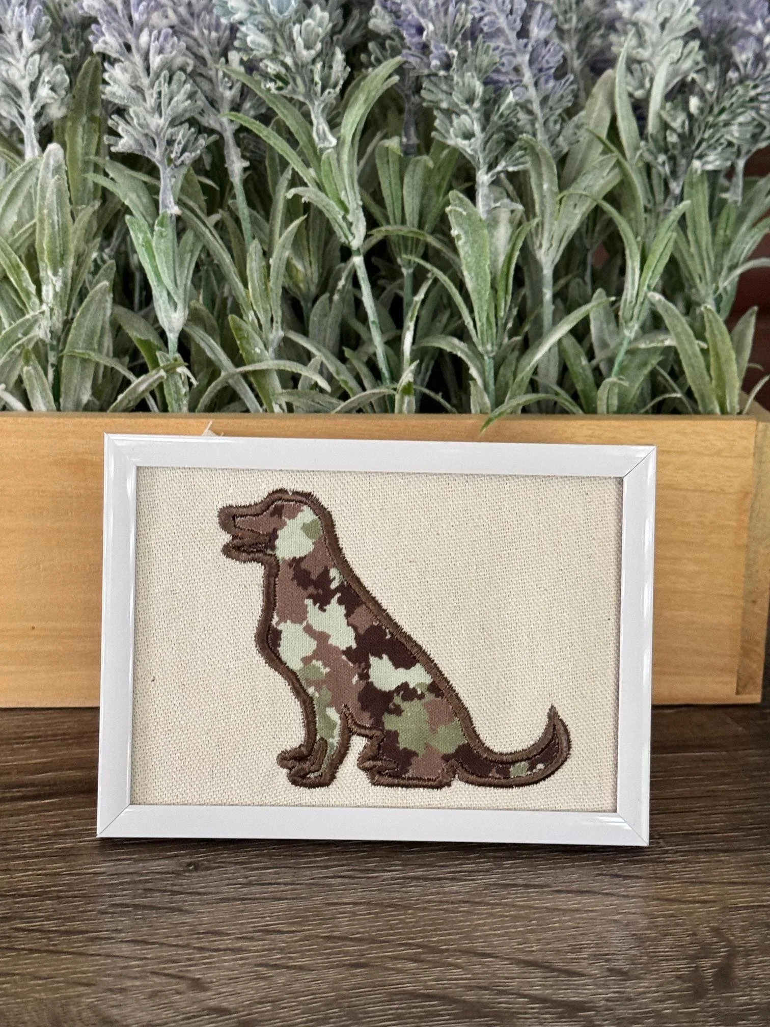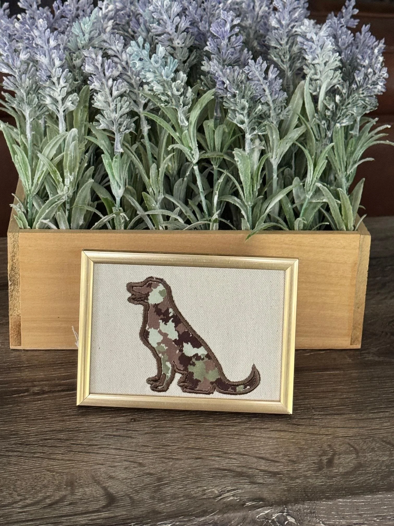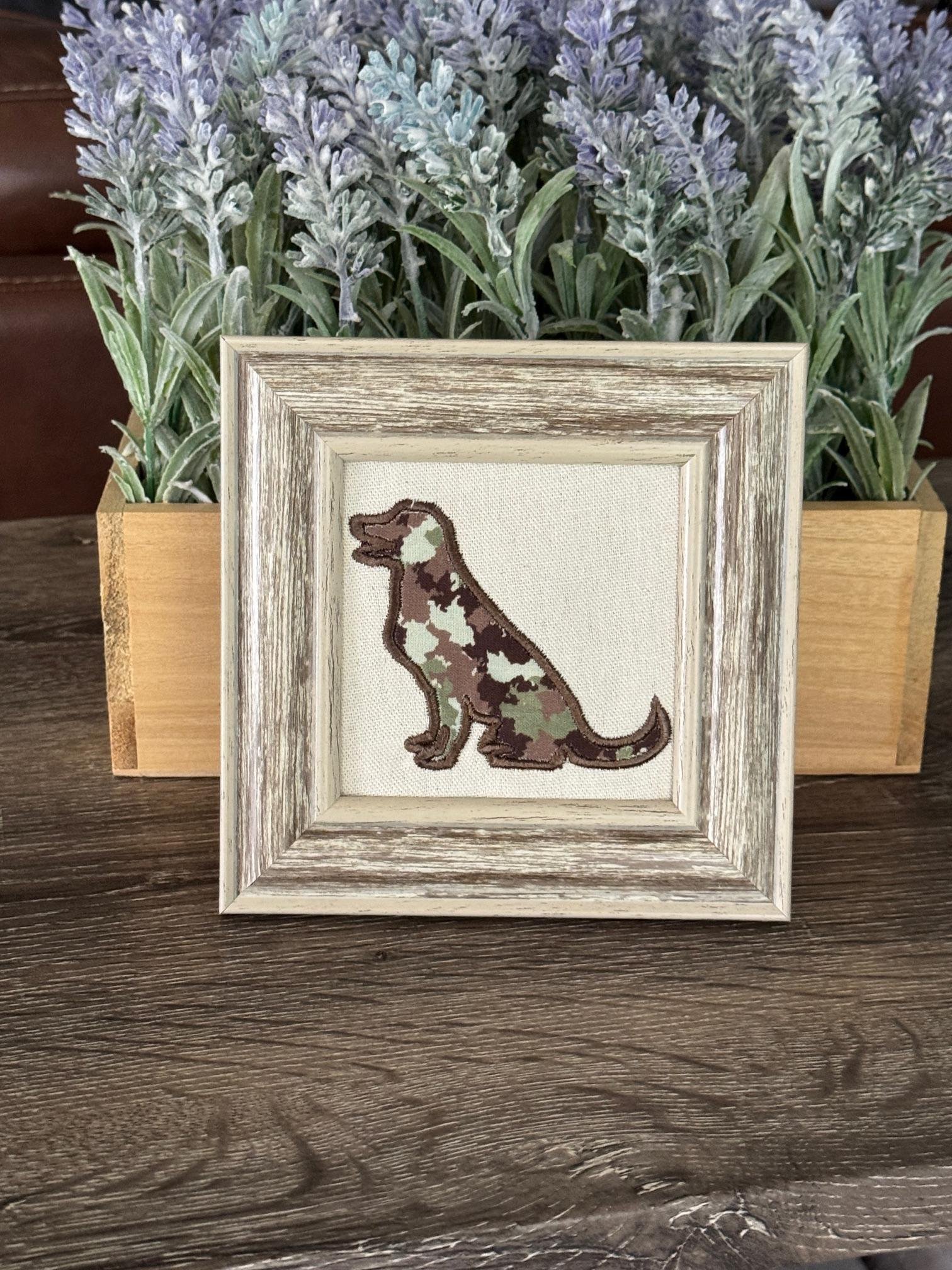 Add a rustic, outdoorsy touch to your home with this Labrador Retriever machine-embroidered appliqué made with camouflage fabric. Perfect for hunters, Lab lovers, and anyone who appreciates country style décor!