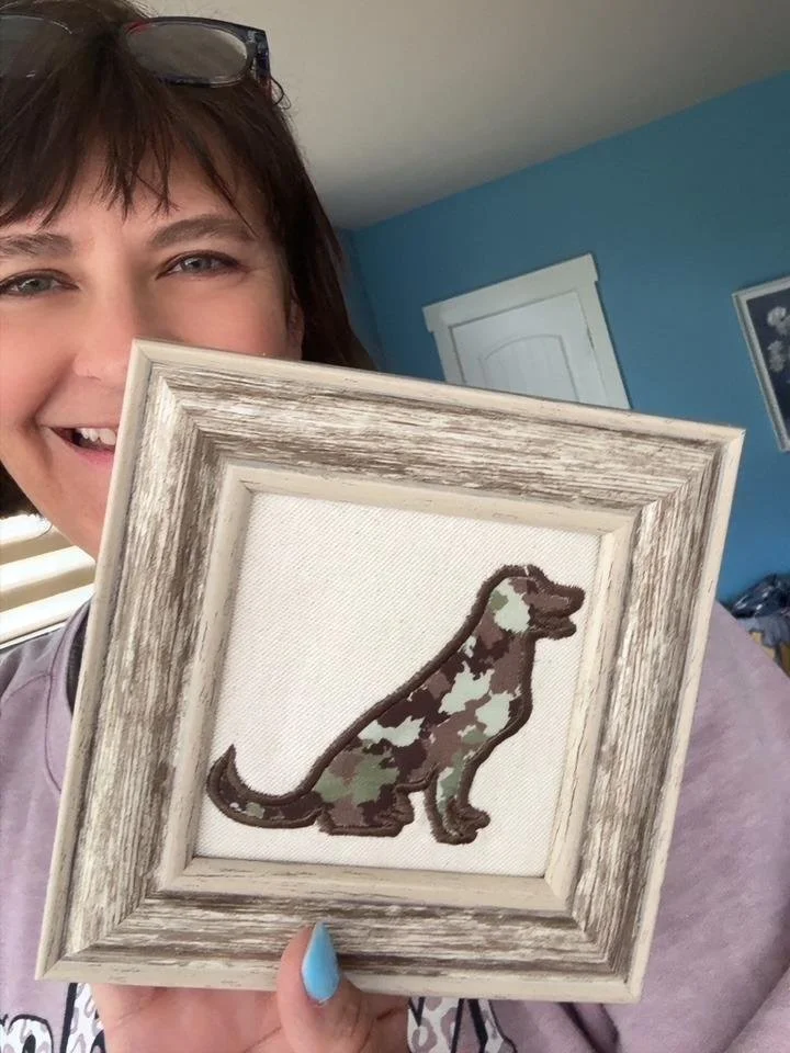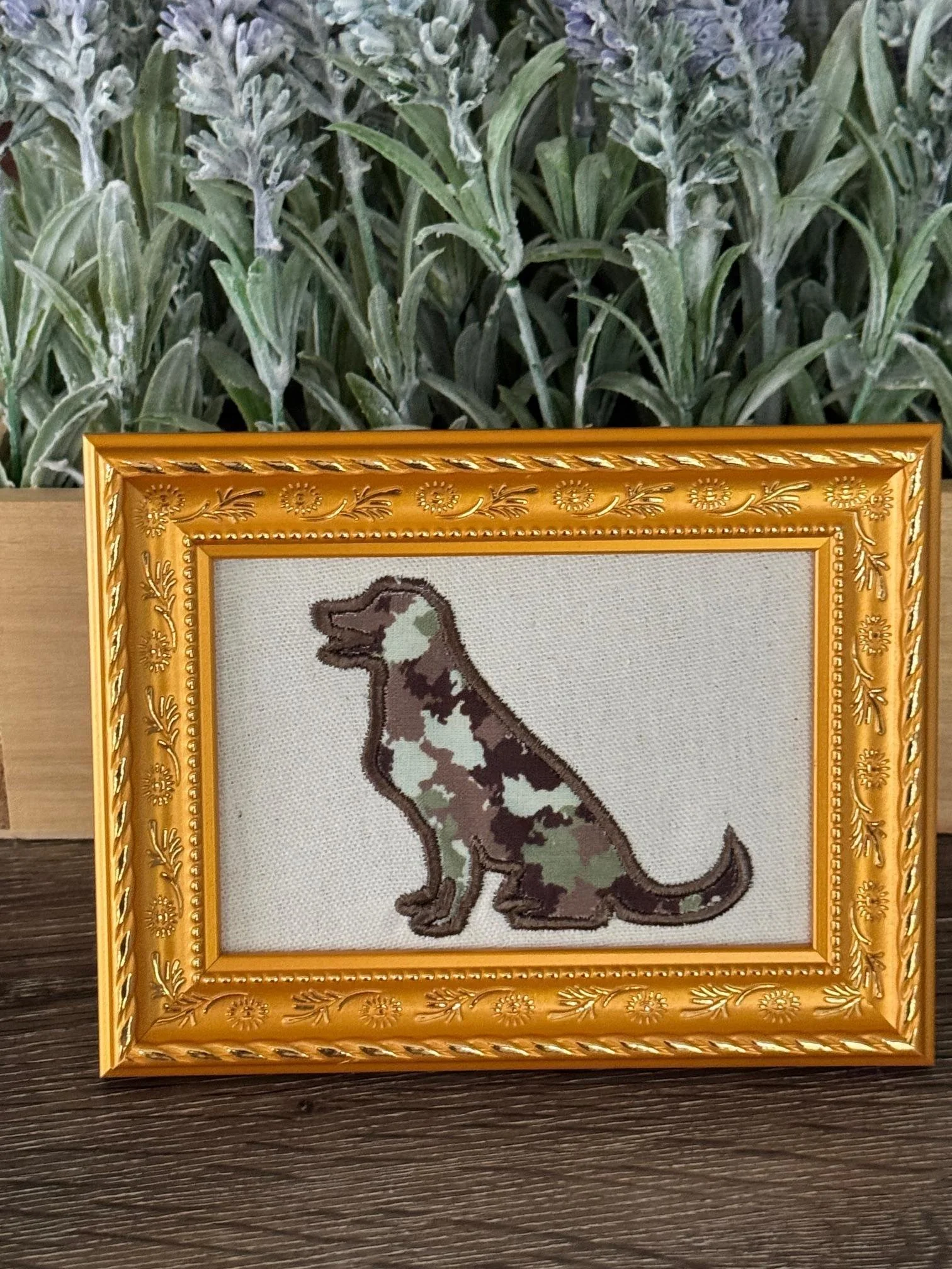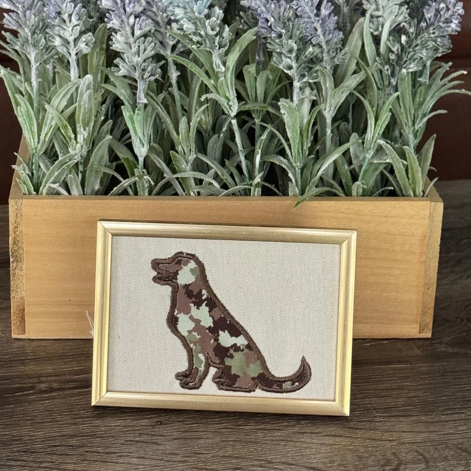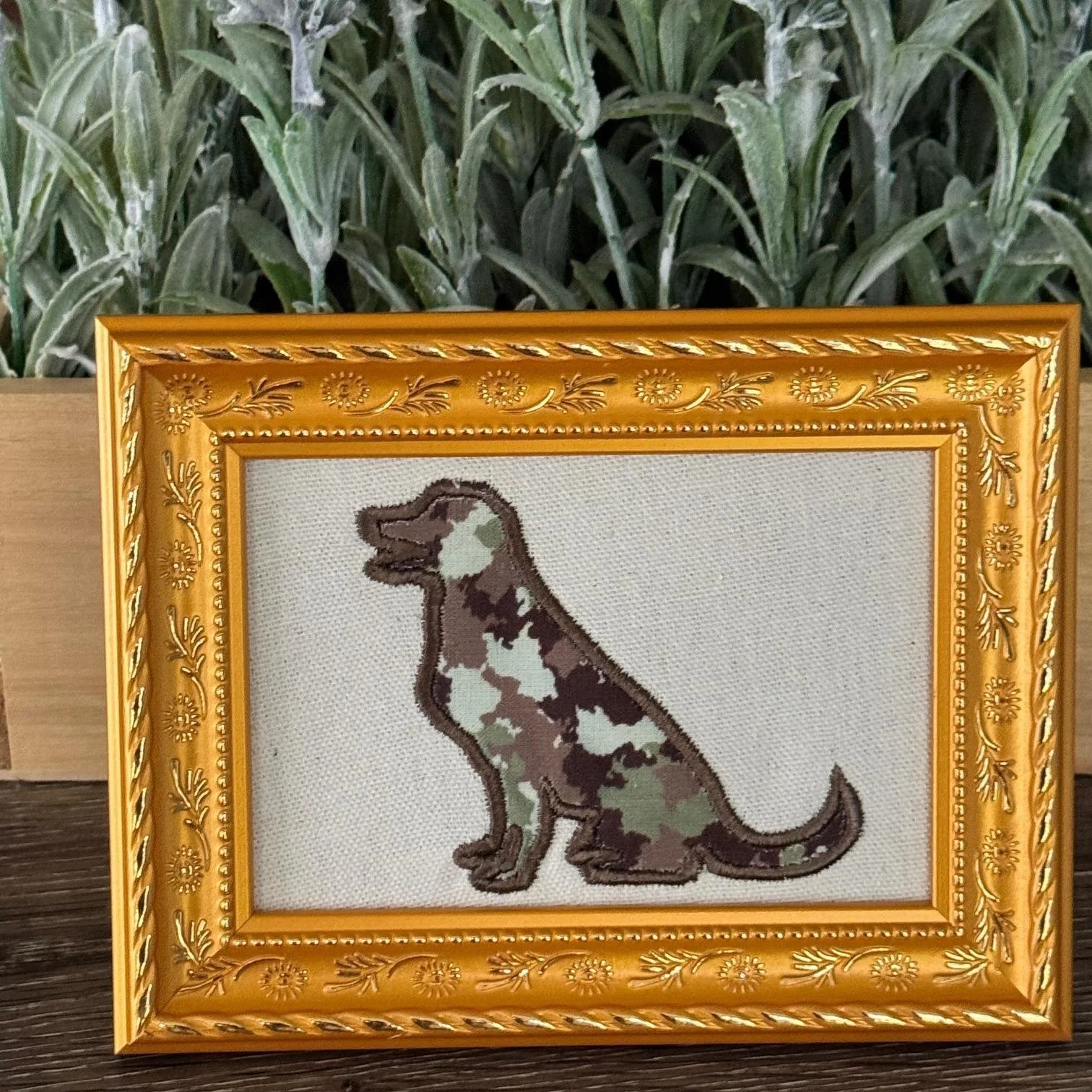 Add a rustic, outdoorsy touch to your home with this Labrador Retriever machine-embroidered appliqué made with camouflage fabric. Perfect for hunters, Lab lovers, and anyone who appreciates country style décor!